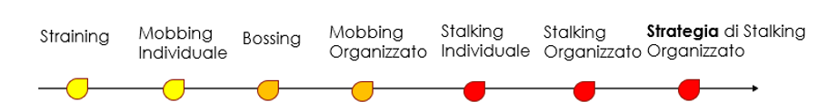 Classificazione delle forme di tipo vessatorio-persecutorio in ambito organizzativo di mia ideazione. Il colore indica la portata in termini di complessità, intensità lesiva fino a giungere alla forma più estrema che si basa sull’uso delle Cyber -Tecnologie, della strategia e tattiche di tipo offensivo- militare e di intelligence, con specifico modus operandi di tipo covert, volto a non lasciare tracce.
